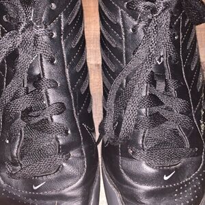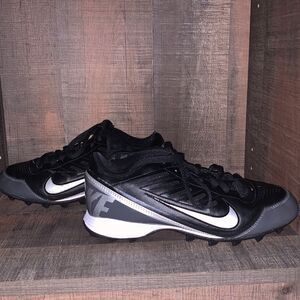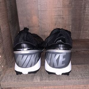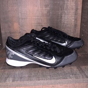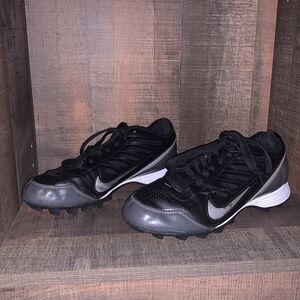 Great condition pair of Nike cleats, size youth six. Black with silver accent. Sole of shoe is in excellent condition with no signs of wear. On the side, Nike sign, there is some slight wear. Please see pic, all stitching, emblems,Etc are intact, and then missing. Comes from clean, smoke and pet free home.