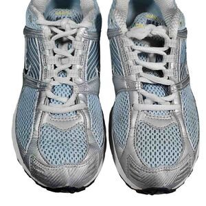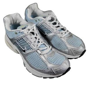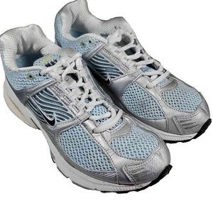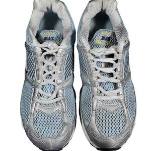 NIKE AIR MAX SIZE 6.5 LITE BLUE & SILVER. Good Pre-loved Condition, Nike plastic logo is broken on one side. Doesn't affect ware. Shoes are part mesh with fabric and leather.
