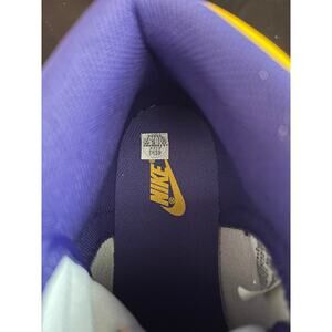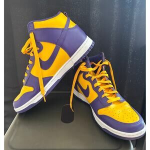 Score big with these awesome Nike Dunk High Tops! These shoes are in excellent condition and ready to turn heads. The vibrant purple and yellow colorway is perfect for any Lakers fan looking to show their team pride in style.