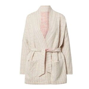 NIKE Womens Yoga Jacquard Reversible Cardigan Robe is a plus size sweater made of cotton blend fabric. It features an open neckline, long straight sleeves, and a tight-knit geometric pattern. The cardigan is reversible and oversized, with a relaxed fit. It is machine washable and suitable for winter and fall seasons. The cardigan is designed for women and is perfect for yoga and sports activities. It comes in pink color and is new with tags.