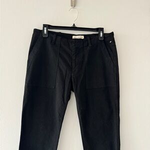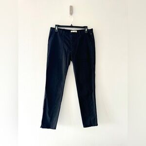 Flat front, low-rise slim pant in brushed stretch twill cotton. Raw hem. Front patch pockets. Back flap pockets. Zip fly. Hook-and-bar closure. Belt loops. Designed to hit ankle length.