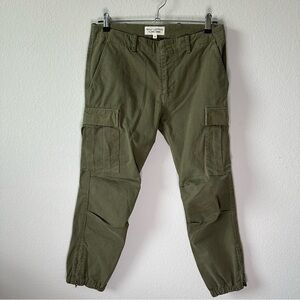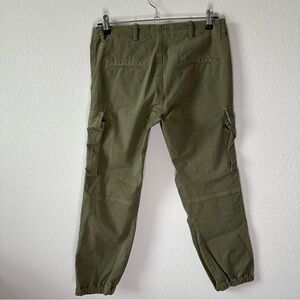 Military inspired silhouette in green brushed stretch-cotton with side cargo pockets. Stone washed for a soft hand. Belt loops at waist band.