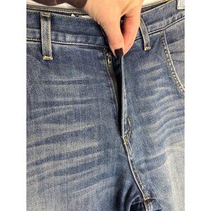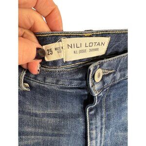 Excellent condition, no flaws, size 25. NILI LOTAN Emerson Mid-Rise Barrel-Leg Jeans. Nili Lotan's 'Emerson' jeans are designed in a barrel-leg silhouette that taper at the slightly cropped hems. They have a mid-rise waist and 'Classic' blue wash that's faded and whiskered for a lived-in feel. The uniquely placed pockets and folded knees give them a distinct utilitarian vibe. Button and concealed zip fastening at front.