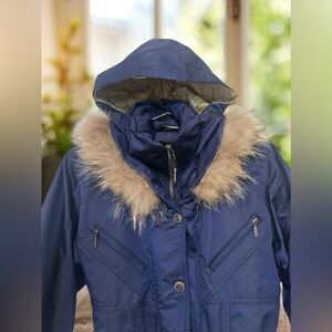 Hidden hood, Zippered / snap front closure, 2 zippered chest pockets , 1 arm pocket, belted , real fur trim.