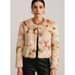 NIMO WANG Faux Fur Jacket Multicolor Pink Brown White Boho Statement Outerwear