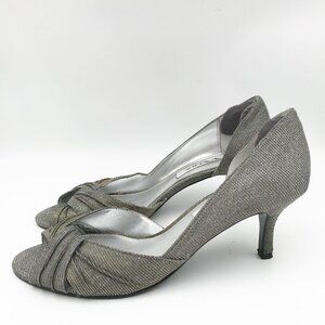 Nina Carrie Steel Luna slip on dress shoes. Silver Gold shimmer, peep toe, stiletto heel, size womens 8.5, have cushions attached at back of heel-see photos. Smoke and pet free home.