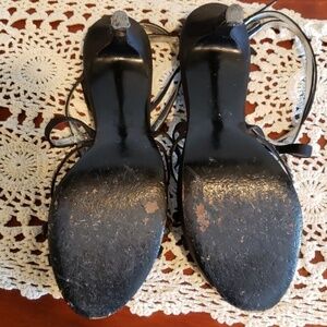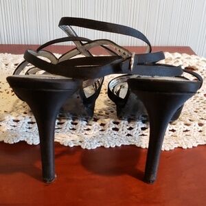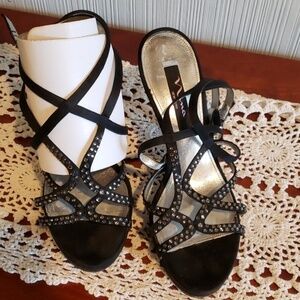 NINA New York Heels Strappy Bling Black/Silver Satin & Rhinestone 8M