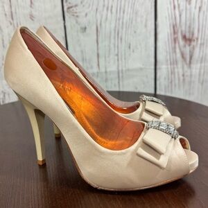 NINA New York peep toe sateen bejeweled pumps champagne colored 4” heel 8.5 EUC