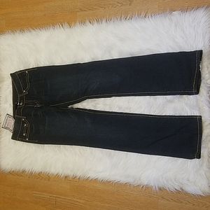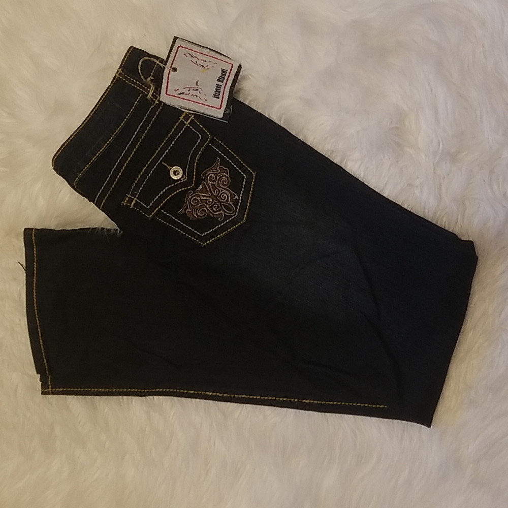 nina rossi blue jeans straight legs front pockets button and zipper closure belt loops back pockets with embroidery design button flap made of 97% cotton 3% spandex size junior 7. BRAND NEW WITH OUT TAGS
