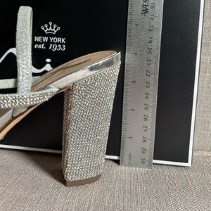 Silver metallic rhinestone encrusted 4” block heels. Elastic straps. Sparkly and perfect for that special occasion!