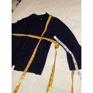 Very Good Condition, Super Soft, navy blue, cut out style, bolero fit, 3/4 sleeves, tagged size L, see measurements for custom fit.