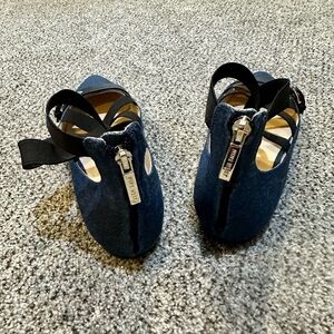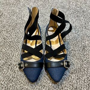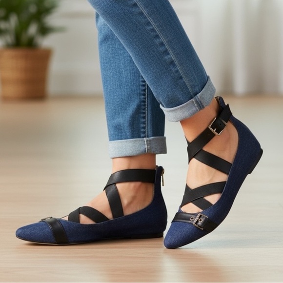 NINE WEST 8.5 Denim Blue Flats Black Straps Ankle Zip Smoak R $99