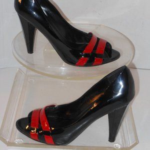 NINE WEST BLACK AND RED LEATHER OPEN TOE PUMPS SIZ