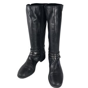 From Nine West are these gorgeous biker inspired black genuine leather boots! With a triple studded ankle strap and harness detail, inside zipper, 1.5" low heel! 14.5" shaft height, 15" shaft circumference at calf! Size 10M, the "What If" model! *Condition Note: there is some tiny peeling at the inside zipper, plz see pix, Otherwise: Excellent! Superb EUC Condition! **ABSOLUTELY GUARANTEED CONDITION: EUC MINTY-EXCELLENT TO LIKE-NEW, by Lily @HauteClub!***