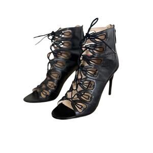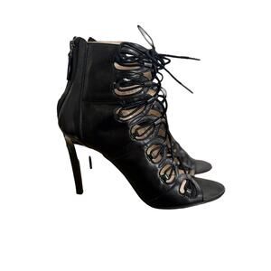 SUPER GORGOUES. BLACK LEATHER UPPER, PEEP TOE, LACE UP FRONT. 4" HEEL. VERY GOOD/EXCELLENT CONDITION.