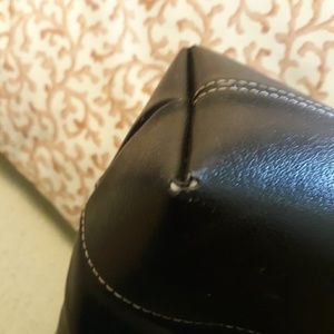 This bag is black vinyl with the supple feel of leather. It is just right for holding your necessities, your purchases, your book, map, lunch or small computer. The top closes with a magnetic snap which leaves the sides open for easy stuffing. Inside, the lining has a zipper pocket as well slip pockets for cards, keys, pencils, etc. I have noted a couple of "scuffs" in photos Straps allow for a 12" drop, making it handy for hand or shoulder. 10.5" W × 11.5" H × 4" D.
