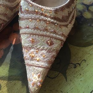 These shoes are brand new and beautiful. Never worn. Beautiful beading. Can absolutely be worn in formal situations or with a cool pair of jeans. Very pointy toe. Bought in an upscale boutique in New York City. Size 9M.
