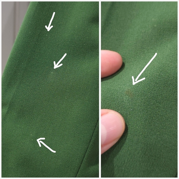 Beautiful emearld green blazer size 4. Preloved but in good condition. Comes with shoulder pads. Front pockets have not fully been unsewn yet. See pictures. Has a few white dots and a small stain at the back of one of the sleeves. Should come out by spot treating or dry cleaning. Priced with this consideration.