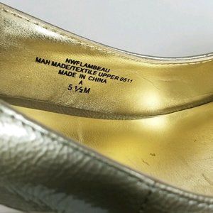 NINE WEST FLAMBEAU PLATFORM HEELS/PUMPS SIZE 5.5 M IN GOOD CONDITION OTHER THAN A FEW PEELING MARKS WHICH I HAVE SHOWN IN THE LAST TWO PICTURES. THEY ARE ON THE LEFT FOOT UPPER TOP INSIDE HEEL AND ANOTHER ON THE RIGHT FOOT LEFT SIDE OF SHOE.