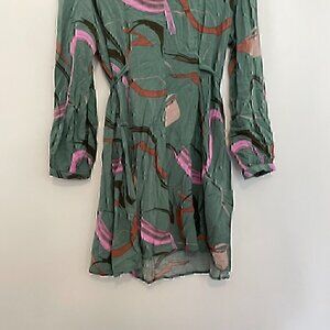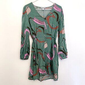 NINE WEST Knot Back Long Sleeve Dress Green Geometric Swirl Tie Bow Short Mini L