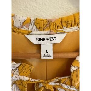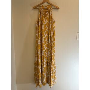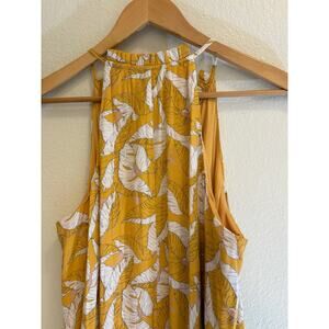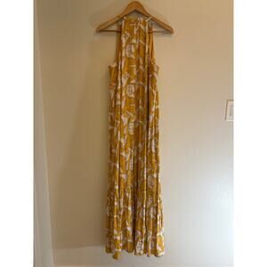 NINE WEST maxi dress, size Large. Beautiful yellow leaf print design with a sleeveless halter neckline and ruffled tiered layers. Fully lined with a super soft, luscious fabric that feels amazing to wear.