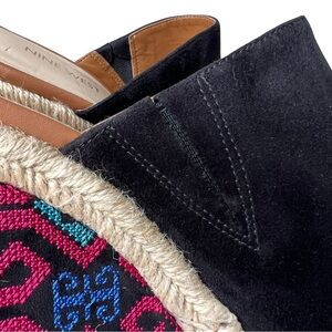 NINE WEST Rare Wedge Suede Mules Platform Cross Stitch Sandals Black Tan 8.5M