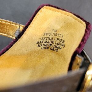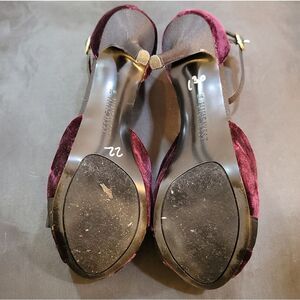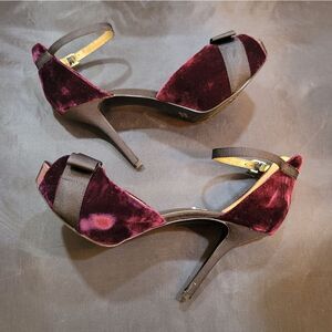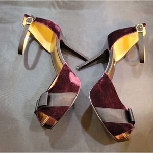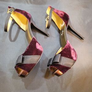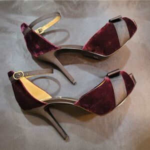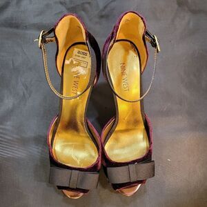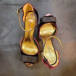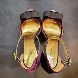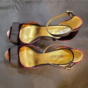 NINE WEST SATIN BOWNOT HIGH HEEL STILETTO OPEN-TOE SANDAL SIZE 8M COLOR BURGUNDY WITH BLACK BOWNOT IN THE TOP ADJUSTABLE BUCKLE ANKLE STRAP CLOSURE BACK STRAP COVER MADE WITH TEXTILE UPPER MAN-MADE LINING HEEL HEIGHT MEASUREMENTS APPROX 5"INCHES THIS ITEMS PRE-OWNED EXCELLENT CONDITION WITH ONLY LIGHT SIGNS OF WEAR IF ANY CHECK THE PICTURES