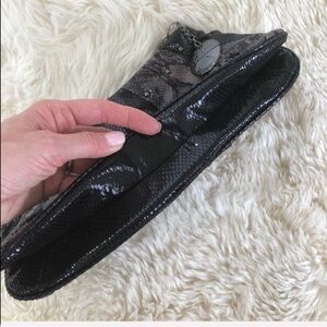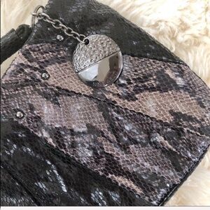 NINE WEST SNAKESKIN CLUTCH. EUC. Clean inside and out. Contrasting patches of gray black and taupe snakeskin faux leather. Silver gray metal stud accent. One zipper pocket inside. Wrist strap is detachable. Perfect for a night out.