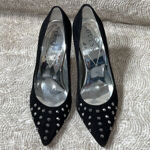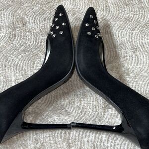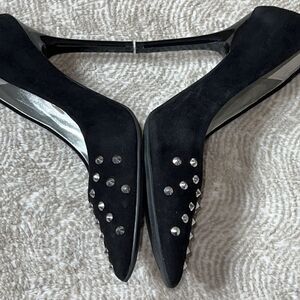 Gorgeous black suede stilettos feature pointed toe adorned with silver toned studs. Worn one time for about 2 hours. In nearly new condition! Heel height approx 4". No water stains, heel markings or scuffs.