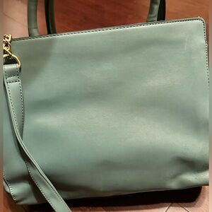 Preowned, excellent condition. This teal color purse, satchel, top handle with Crossbody strap and a bow accent. With gold hardware