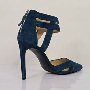Style: leather suede, pointed-toe, ankle strap, covered stiletto, crisscrossing vamp,