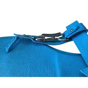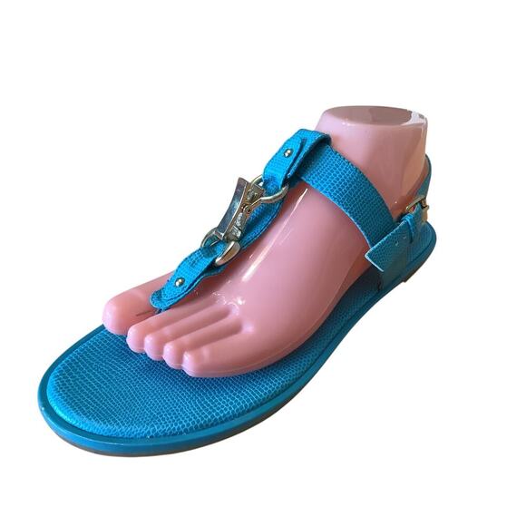 NINE WEST faux leather turquoise toe post slingback sandals. Size 9.5. In very good condition. Decorative latch on top. Snake embossed, adjustable silver tone buckle ankle strap. Tiny nick on the front of the left sandal. Please see last pic.