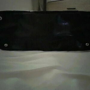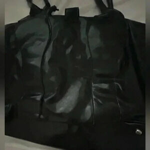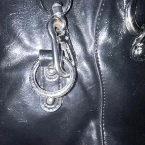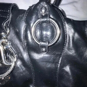 NINE WEST WOMENS DOUBLE STRAP BLACK PURSE MULTI POCKETS PRINT LINING SNAP DRAWSTRING AND CLASP HOOK CLOSURE SILVER HARD WARE GOOD CONDITION BOTTOM HAS SOME WEAR ON THE BOTTOM STUDS