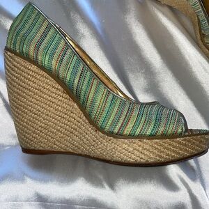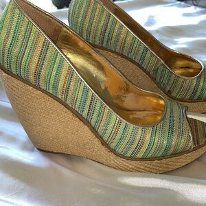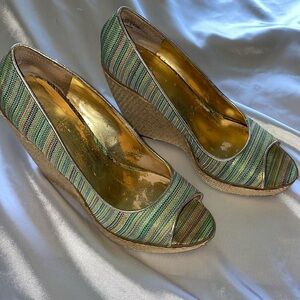 NINE WEST Willow Multi Color Fabric Woven Wedges Size 8.5. Great shape. Gold interior shows wear.