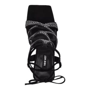 Bring the heat in the Nine West Alanah. This strappy sandal features a tapered heel and criss-cross straps embellished with rhinestones, complete with an adjustable ankle wrap. Perfectly paired with dresses for a night out on the town.