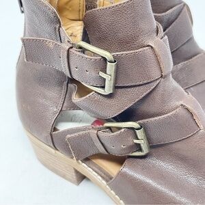 NINE WEST Women’s Brown Leather WATERLOO Buckle Closure Open Side Booties 8.5. Good pre-owned condition. Gentle signs of wear. Some peeling of lining on inside. See photos. All measurements are approximate.