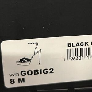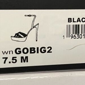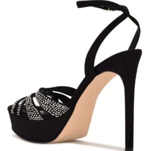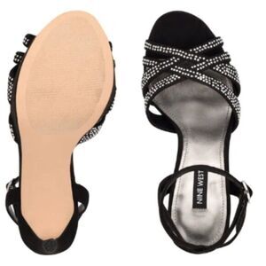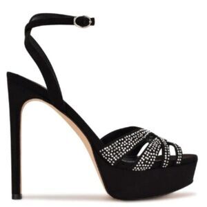 BRAND NEW with box NINE WEST Gobig platform dress sandal, BLACK These sky high stiletto sandals feature glamorous, rhinestone adorned woven straps and a skinny adjustable ankle strap. Heel Height:4.8" Platform Height:1.18" Heel Type:Platform Toe Type:Open Toe Upper Material:Textile Outsole Material:Manmade Lining Material:Synthetic A1011-7.5 A1012--8