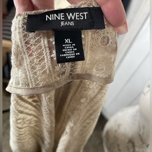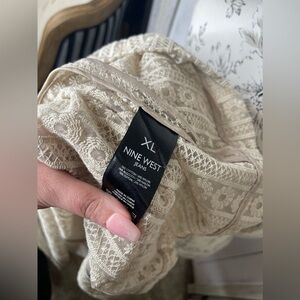Elevate your wardrobe with this exquisite NINE WEST Women's Lace Open-front Duster. This basic, lightweight piece has a solid pattern with a beautiful floral design that adds a touch of femininity to any outfit. The sleeveless duster is made of a cotton blend outer shell material and chiffon fabric, making it perfect for any season. The open-front design and accents give it a relaxed yet stylish look that can be worn for any occasion, whether it's for workwear, a party, or a casual day out. It's available in XL size and beige color to suit any style.