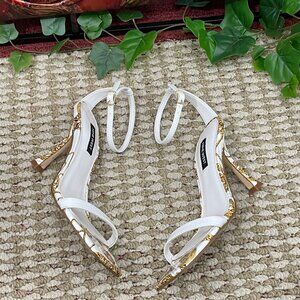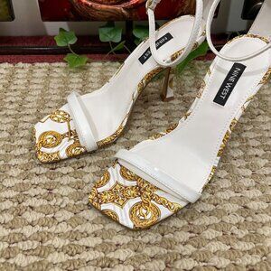 NINE WEST Yess Square Toe Tapered Heel Dress Sandals in White Chain Multi Size 6
