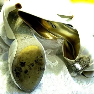 Beautiful white satin 4 inch heels with silver glitter accent. Worn one time for my wedding. Great condition and served their purpose to make me tall enough for our pictures. 😊