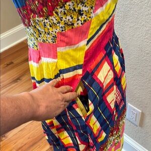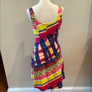 Embrace a casual vibe with this vibrant mini sundress, featuring a scoop neckline and sleeveless design. The dress showcases a lively mix of red, orange and blue hues, perfect for resort wear. Its playful patterns and fitted bodice make it a standout piece for any sunny day.