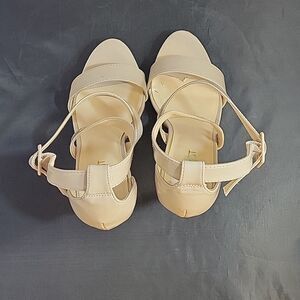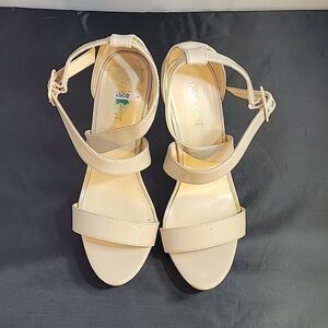 NINE WEST OPEN TOE THREE ADJUSTABLE BUCKLE ANKLE STRAP WOMEN"S SANDAL SIZE 71/2M COLOR TAN Stand tall in these Nine West women's strappy platform sandals. A latex padded insole is selected to deliver added comfort, while a PVC outsole is lightweight and provides greater grip. Plus, a cross strap design is effortless to slip on and off, and the buckle closure delivers a perfect fit.Strappy platform sandals with a man made upper man made lining balance man made Heel measures approximately 5 inches"vPlatform measures approximately 1"(approx) Latex padded insole for added comfort Crossed strap design with adjustable buckle closure Lightweight PVC outsole Heel height: 5" (approx) Platform height: 1"(approx) THIS ITEMS IS PRE-OWNED EXCELLENT CONDITION WITH ONLY LIGHT SIGNS OF WEAR IF ANY CHECK THE PICTURES