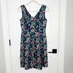 V-Neck sleeveless fit and flare dress. Navy with pink, green and white floral print all over. Unlined with pockets.