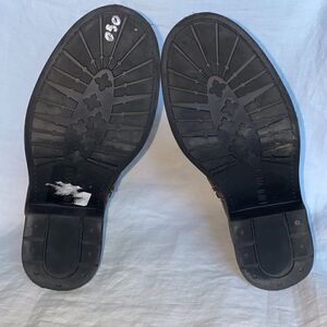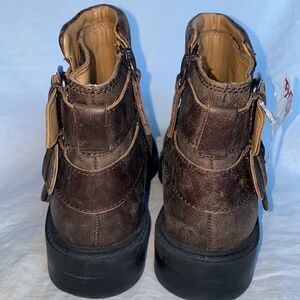 A Brown leather moto bootie with a channel quilted cuff and double buckle accent with a side zip for easy on and off. Black non slip sole. Size 5. NEW!!