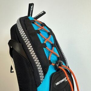 Rugged nylon materials with contrasting elastic drawstring detail.