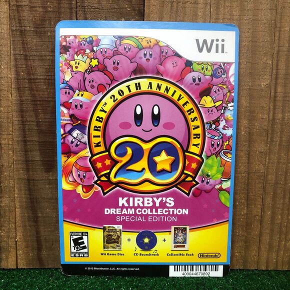 The product is a Blockbuster Video backer card for the Nintendo Wii game "Kirby's 20th Anniversary." This shelf display backer card features multi-color designs and was made in the United States. The backer card is specifically for promoting the Kirby game at Blockbuster Video stores and does not include the actual game. It is a collectible item related to merchandise and memorabilia of the Nintendo Wii Kirby's 20th Anniversary game.