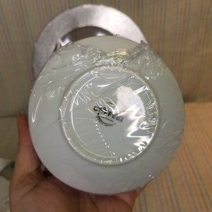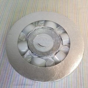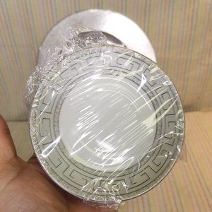 This is a "Coffee Me" set of silver and white espresso cups and saucers by Aramco Imports. They have a Greek key design. The box is open and there is some wear to the Styrofoam mold however the saucers are still in shrink-wrap. The cups are "loose" but appear to have never been used. The saucer diameter is approximately 4.5" and the cups are approximately 2.5" tall.