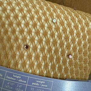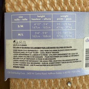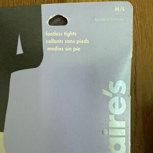 Y2K new and package Claire’s footless tights in size medium/large. According to the size chart on the back medium/large is best suited for someone who is between 5‘4“ tall and 5‘8“ tall and 125 to 160 pounds. The first pair is open, weave almost like a fishnet in tan with sporadic crystals and clear and pink. The second pair is dark gray and mostly opaque with the exception of Paisley lace panel that runs down the outside of the leg and is a little bit sheer.