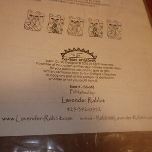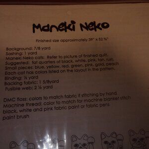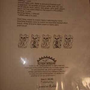 New in package from Su-Sun Designs, 2002 Quilt Pattern "Maneki Neko," finished size 39" by 52-3/4". Cute as can be Asian-inspired kitties grace this colorful lap or child quilt.