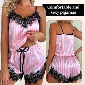 NIP - 2Pc Sexy Camisole Pink & White Stripe with Lace Edge V-Neck Pajama Set - L